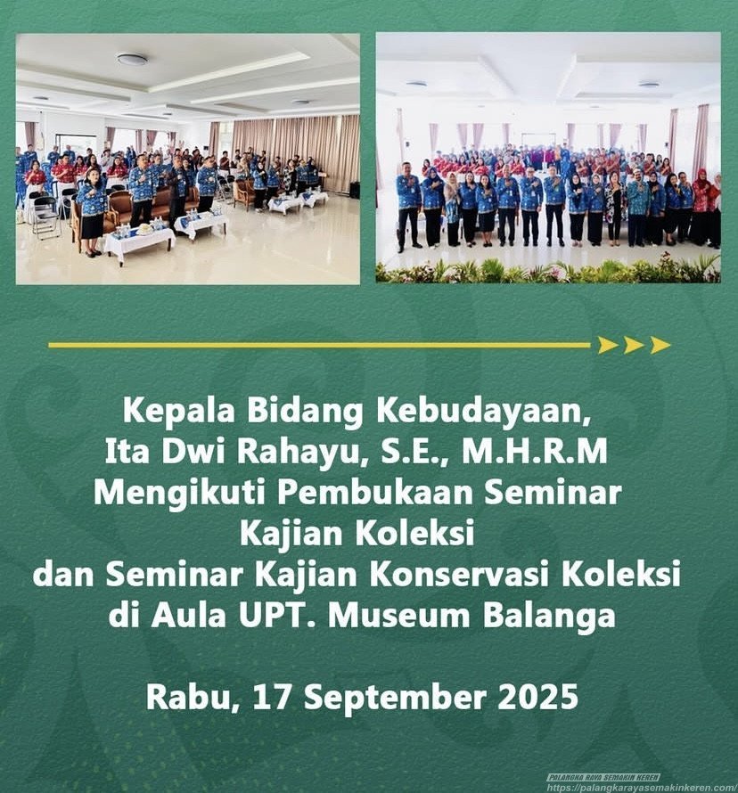Palangka Raya, Layarkalteng.co.id — Kepala Bidang Kebudayaan Dinas Pariwisata, Kebudayaan, Pemuda, dan Olahraga (Disparbudpora) Kota Palangka Raya, Ita Dwi Rahayu, S.E., M.H.R.M, menghadiri kegiatan Pembukaan Seminar Kajian Koleksi dan Seminar Kajian Konservasi Koleksi yang diselenggarakan di Aula UPT Museum Balanga, Pada Tanggal 17 September 2025 Palangka Raya.(Kamis,23/10/25)