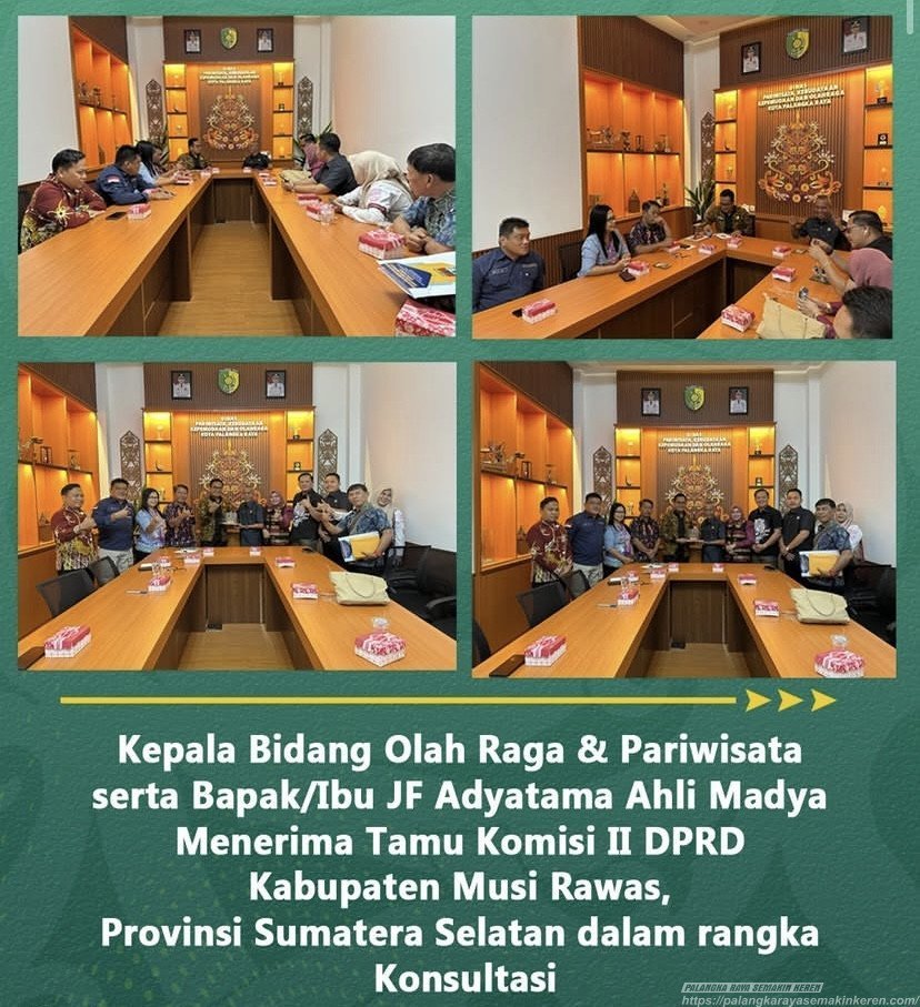 Palangka Raya, Layarkalteng.co.id – Dinas Pariwisata, Kebudayaan, Kepemudaan, dan Olahraga (Disparbudpora) Kota Palangka Raya menerima kunjungan kerja dari Komisi II DPRD Kabupaten Musi Rawas, Provinsi Sumatera Selatan. Kunjungan tersebut diterima langsung oleh Kepala Bidang Olahraga dan Pariwisata, didampingi oleh JF Adyatama Ahli Madya, di ruang rapat Disparbudpora Kota Palangka Raya.(Kamis,23/10/25)