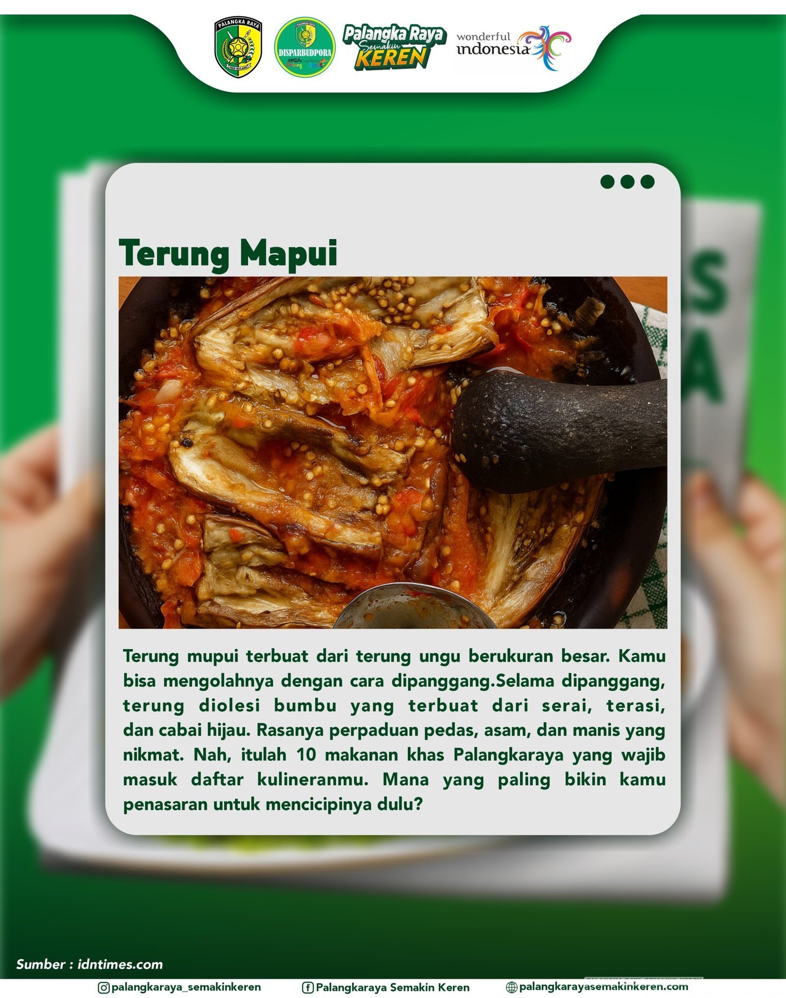 Palangka Raya Semakin KEREN – Kota Palangka Raya kembali memperkenalkan salah satu kuliner tradisional yang menjadi kebanggaan masyarakat Dayak, yaitu Terung Mapui. Hidangan sederhana berbahan dasar terung ungu berukuran besar ini memiliki keunikan tersendiri yang membuatnya digemari baik oleh masyarakat lokal maupun wisatawan.(Rabu,17/9/25)