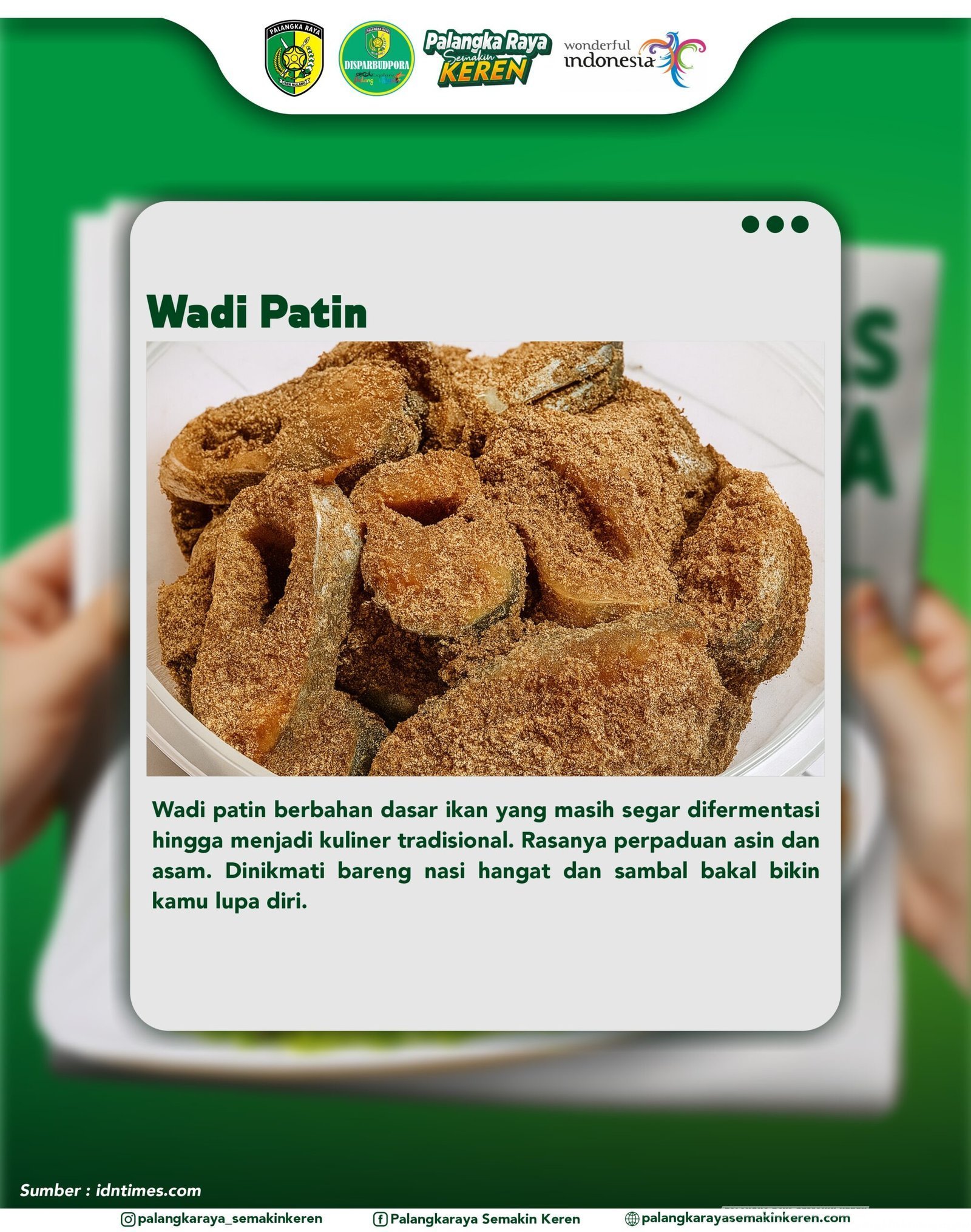 Kepala Dinas Pariwisata, Kebudayaan, Kepemudaan, dan Olahraga (Disparbudpora) Kota Palangka Raya menyampaikan, “Kuliner tradisional seperti Wadi Patin bukan hanya soal rasa, tetapi juga bagian dari identitas budaya kita. Melestarikan dan memperkenalkan makanan khas ini berarti menjaga warisan leluhur agar tetap dikenal lintas generasi.”