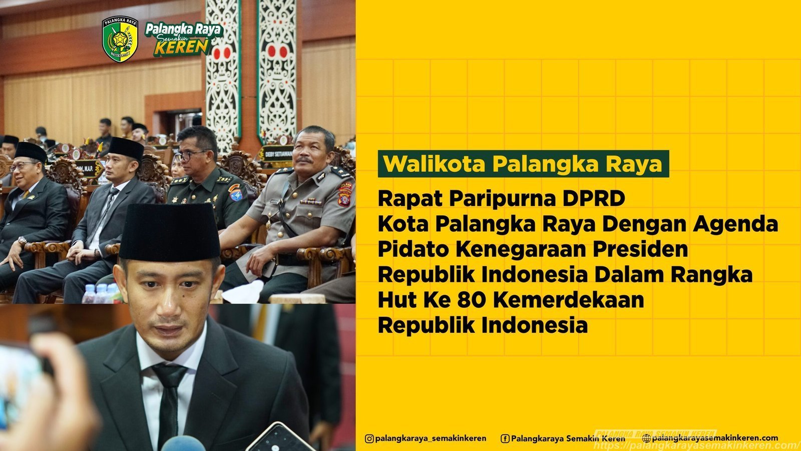 Rapat Paripurna DPRD Kota Palangka Raya yang dirangkaikan dengan agenda pidato kenegaraan ini berjalan khidmat dan penuh makna. Melalui momen bersejarah ini, Pemerintah Kota Palangka Raya menegaskan komitmennya untuk terus berkontribusi dalam mewujudkan Indonesia Emas 2045, dengan membangun daerah yang maju, religius, energik, dan nyaman.